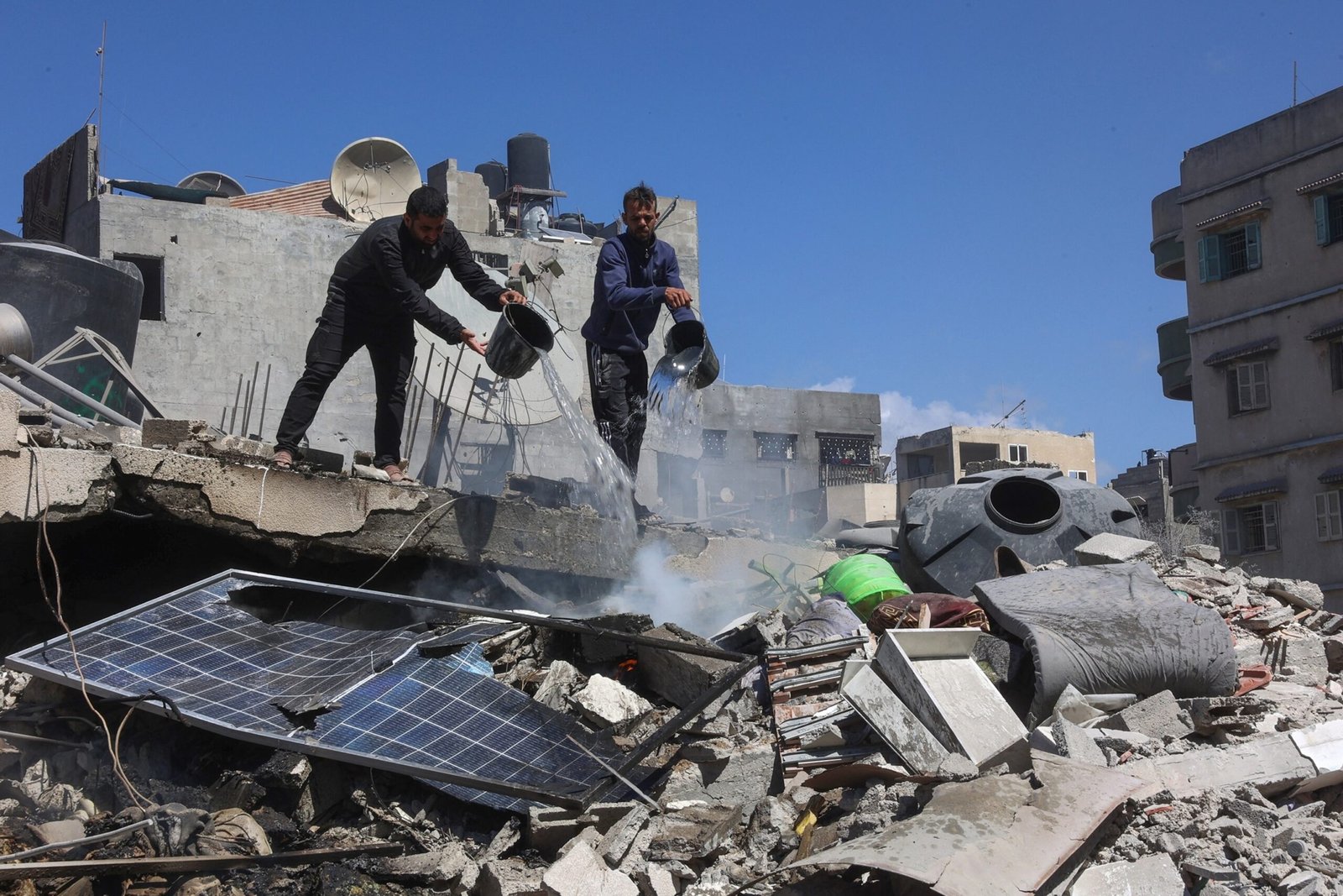 19 मार्च, 2025 को गाजा शहर में अल-सबरा पड़ोस में इजरायल की हड़ताल में नष्ट होने के बाद फिलिस्तीनियों ने एलियास तराज़ी परिवार के घर के मलबे में आग बुझाई।