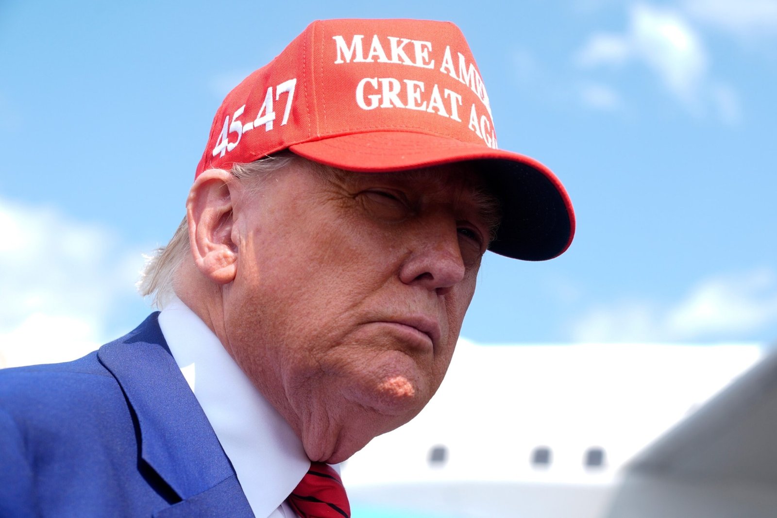 राष्ट्रपति डोनाल्ड ट्रम्प 20 जून, 2025 को न्यू जर्सी के मॉरिसटाउन में मॉरिसटाउन नगरपालिका हवाई अड्डे पर पहुंचने पर प्रेस से बात करते हैं।