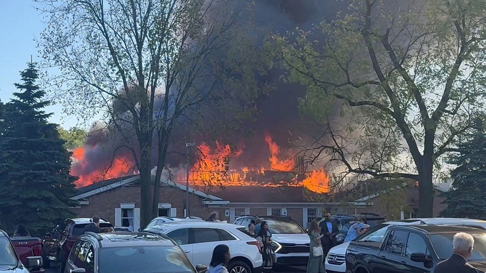 एक घटना के बाद धुआं और आग की वृद्धि, जिसमें एक व्यक्ति ने मिशिगन चर्च के सामने के दरवाजों के माध्यम से अपने वाहन को दुर्घटनाग्रस्त कर दिया और एक हमले की राइफल के साथ आग लगा दी और ग्रैंड ब्लैंक, मिशिगन, 28 सितंबर, 2025 में चर्च एब्लेज़ को सेट किया।